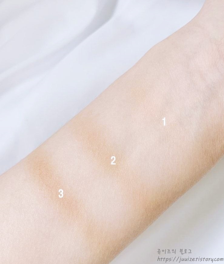 피부에 발색 했을 때도 1번 색상은 역시 발색이 연하네요.