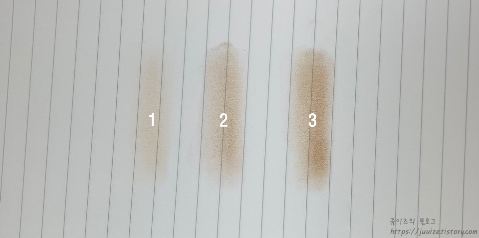 색상은 3가지로 나누어져 있어요.* 모든 발색은 여러분들에게 색깔을 보여주기 위해서 여러번 덧칠한 겁니다.